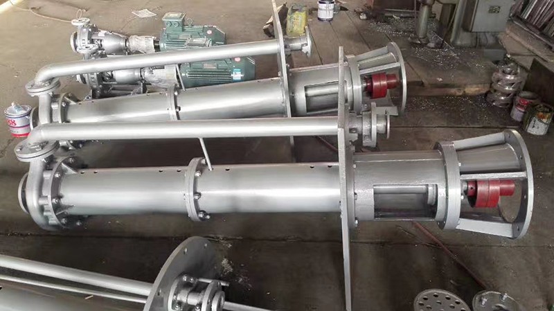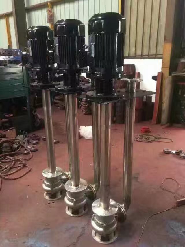 液下化工泵的形式为长轴立式离心泵,与介质接触部分采用铸钢或不锈钢制造,根据客户要求液下深度由0.5m-6m不等,工作部分淹没与液体中,具有使用范围广,效率高,无需灌液即能输送,由于泵运转产生的轴向力及径向力分别由液上部分的滚动轴承和液下的滑动轴承支撑,因此运行宁静无噪音,是集环保节能的高科技产品。